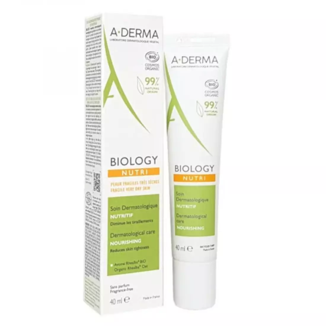a-derma biology nutri soin nutritif peaux fragiles tres seches 40ml est le 1er soin nutritif Bio pour les peaux fragiles très sèches qui lui redonne tout son équilibre avec la plus haute tolérance : produit testé sous contrôle dermatologique et ophtalmologique et sur peau sèche sujette à l’eczéma atopique. Il nourrit intensément et renforce la barrière cutanée, favorise la diminution des plaques sèches et des sensations de démangeaisons, hydrate pendant 24h et participe à l’équilibre du microbiome de la peau. Sa texture crème fine procure un effet enveloppant pour protéger la peau des agressions extérieures. Son utilisation hybride permet à ce soin d’être appliqué seul ou mélangé à une autre crème dermatologique, pour un soin sur-mesure. Bonne base de maquillage.