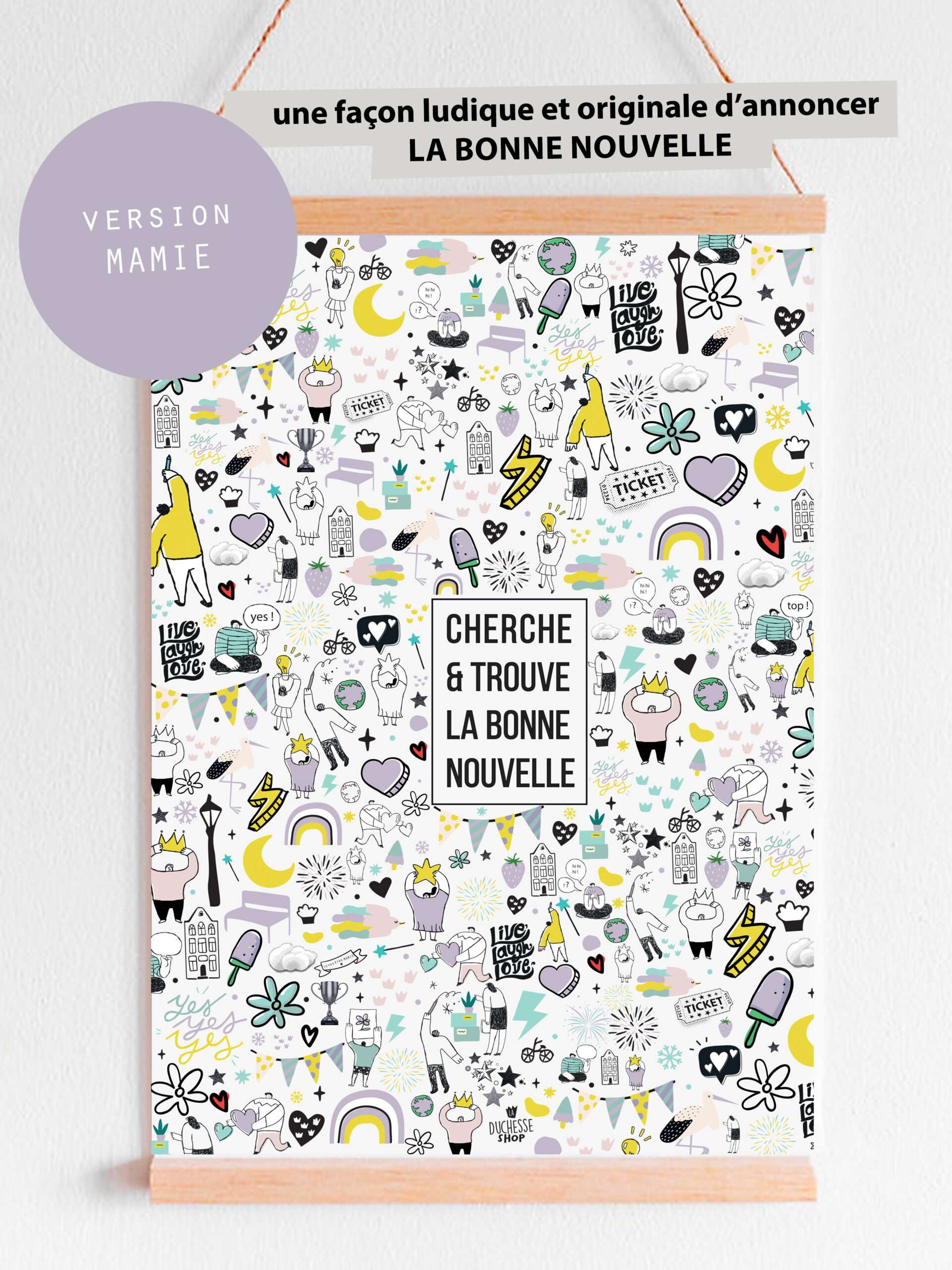 Découvrez l’affiche annonce “Tu vas être mamie”. Idée originale pour annoncer l’arrivée imminente de votre bébé. Un cadeau idéal pour annoncer la bonne nouvelle à la future mamie ! Ludique cette affiche permet d’être gardé en souvenir. Cette affiche existe en d’autres versions : bébé est en route, grands-parents, papy.
