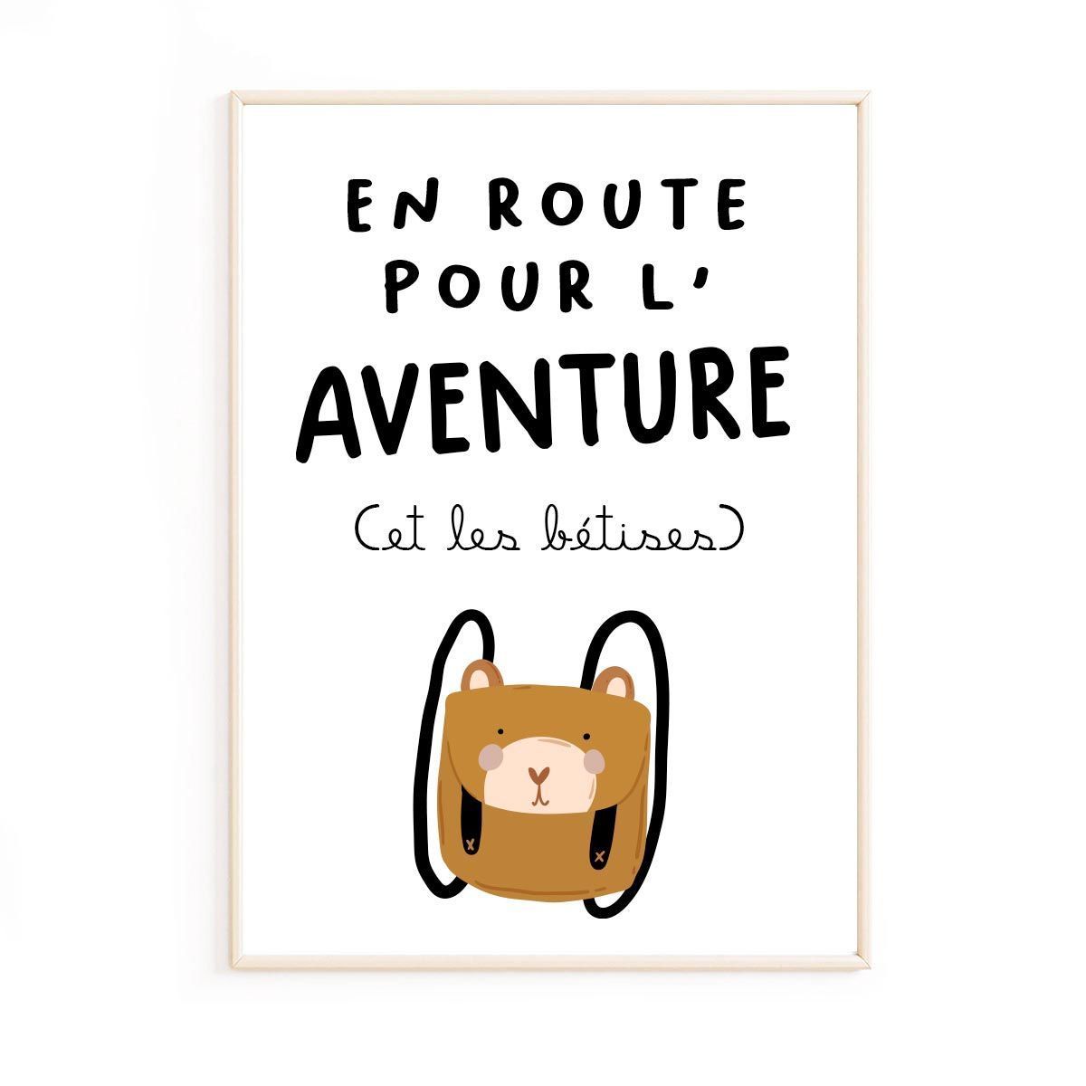 Affiche pour enfant 30x40cm ou 50x70cm Poster citation « En route pour l’aventure » Impression numérique haute qualité avec des encres latex Papier de qualité 150g/m2 Finitions mat Expédition sous 5 à 8 jours ouvrés