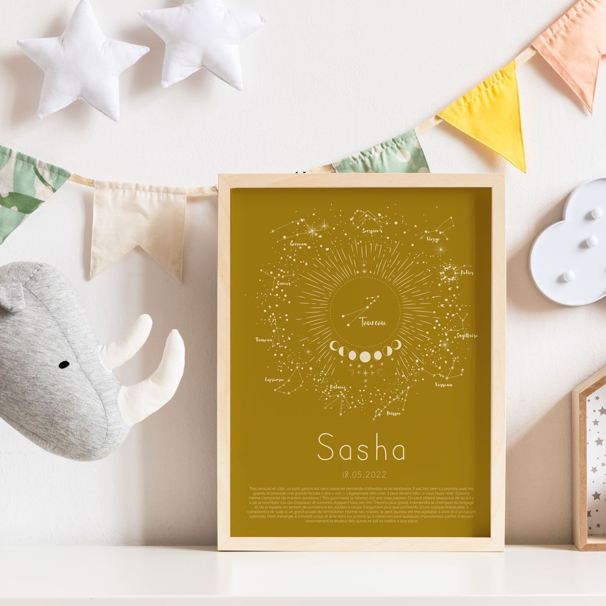 Notre affiche signe astrologique de naissance pour enfant et bébé ont été imaginés pour garder un souvenir précieux de la naissance de votre enfant. Chaque affiche arbore les informations de naissance de bébé : son prénom, sa date de naissance, sa taille, son poids… Elles feront un cadeau de naissance super original pour célébrer cet heureux évènement et compléteront à merveille la décoration de chambre de bébé. Nos affiches sont imprimées et fabriquées en France sur-demande, sur un papier de 275g/m2 de haute qualité avec une finition satinée et une surface lisse. Le papier utilisé est résistant au vieillissement.