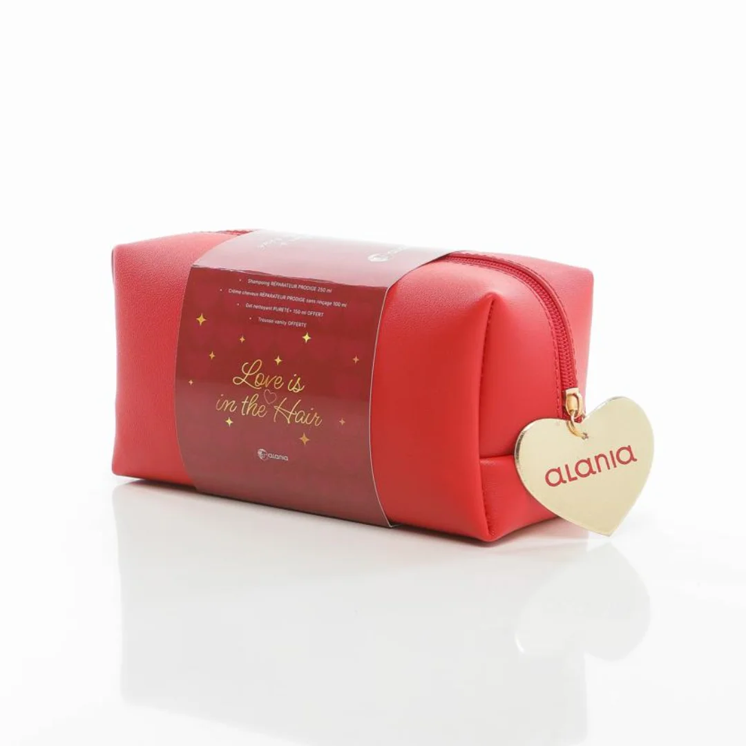 ALANIA TROUSSE LOVE IS IN THE HAIR 🧴 ALANIA Shampooing Réparateur Prodige 250ML 🌿 🍊 ALANIA Pureté+ Vitamine C Gel Nettoyant 250ML✨ 💧 ALANIA Crème Cheveux Sans Rinçage 100ML 💆♀️ 🎁 Trousse pratique pour emporter vos essentiels 🌟