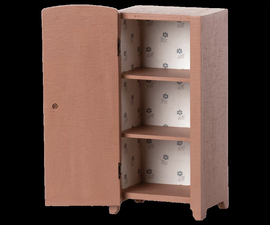 Cette armoire vintage en bois rose a une jolie gravure sur le devant de sa porte et, un papier peint à l’intérieur, ainsi que 2 jolies étagères en bois rose. Ce placard s’intègre parfaitement dans la maison de poupée Maileg.