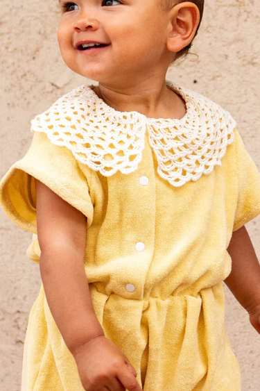 Cette barboteuse emblématique de chez Marsou se porte un peu loose. Son col crochet décalé lui donne un côté retro très craquant. Côté coupe on retrouve : des boutons pressions beige sur le devant, une fermeture à pression à l’entrejambe pour faciliter l’habillage et le change, une ceinture élastiquée donne une jolie forme bloomer.