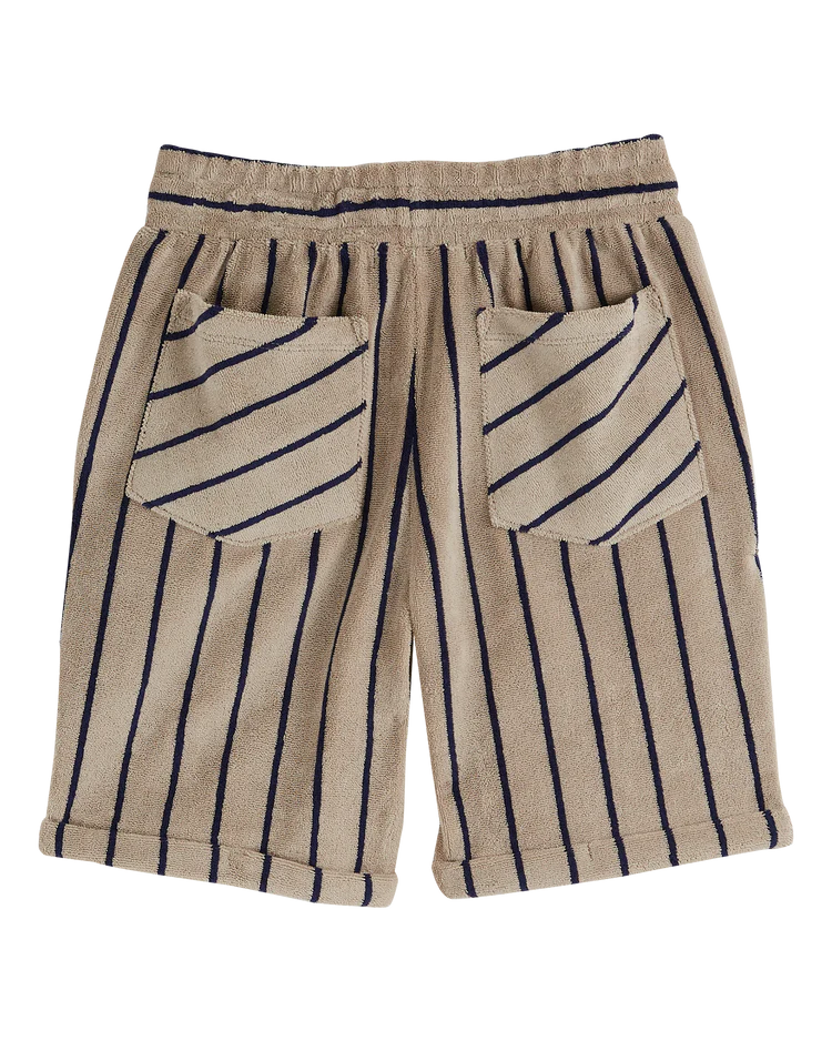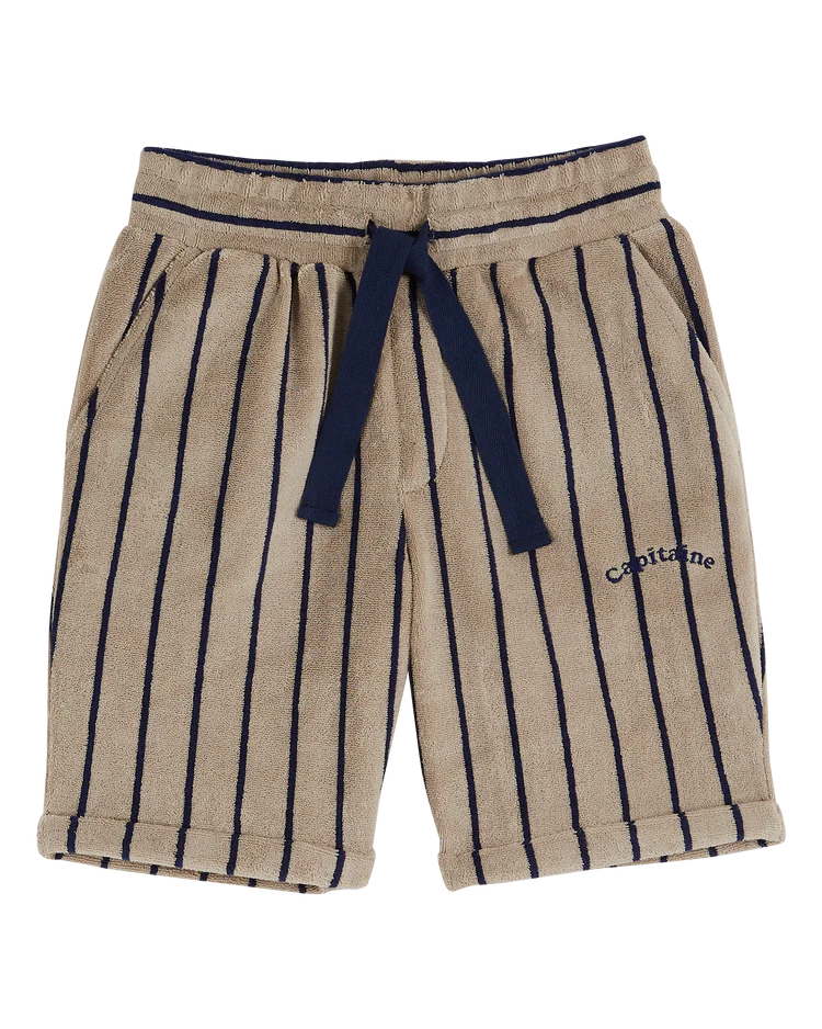 Bermuda en jersey de coton éponge beige à rayures verticales bleu marine, confectionné dans un mélange de coton et de polyester tout doux, moelleux, extensible et confortable. Monté sur une ceinture élastiquée reprise avec un cordon de serrage pour ajuster la taille, deux poches italiennes avec des rayures obliques. Une discrète broderie bleu marine sur la cuisse nous informe que le porteur du bermuda est le capitaine…