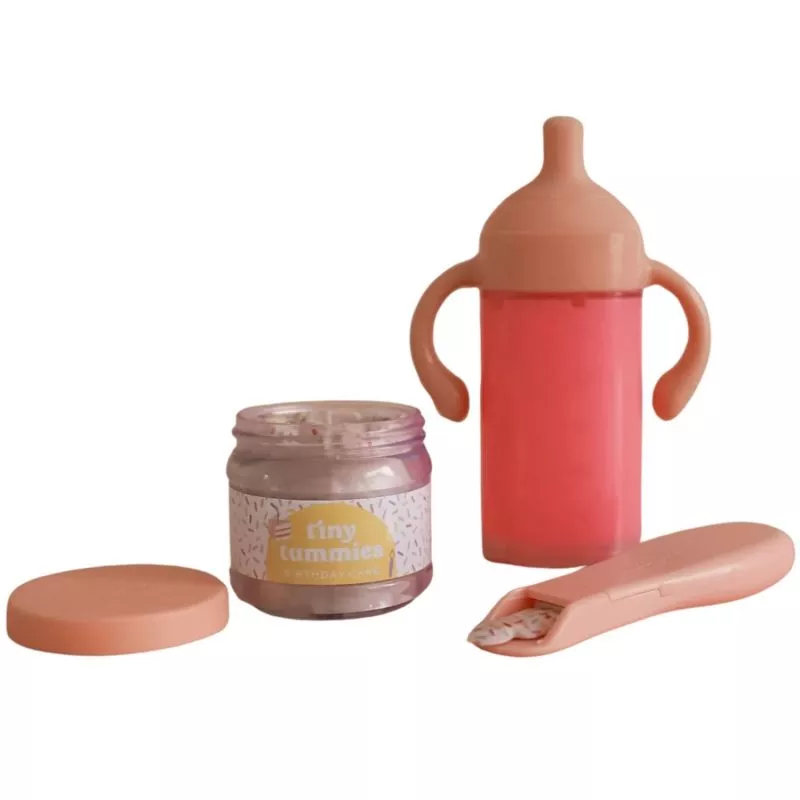 - Contient 1 pot de purée factice, 1 cuillère dotée d’un mécanisme rétractable et 1 biberon de lait.