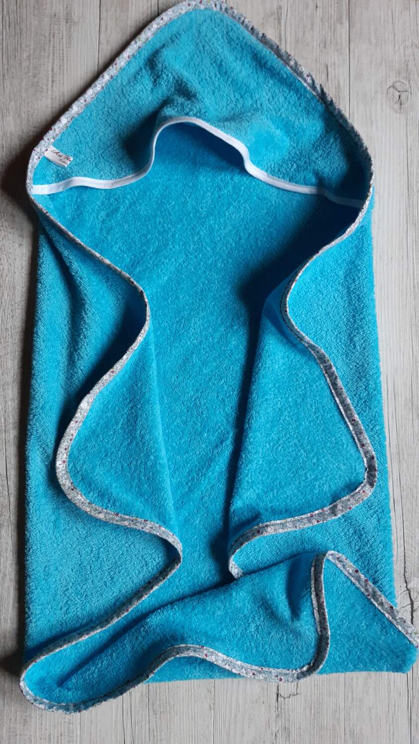 Douce et bien enveloppante, cette cape de bain est en éponge. Biais assorti