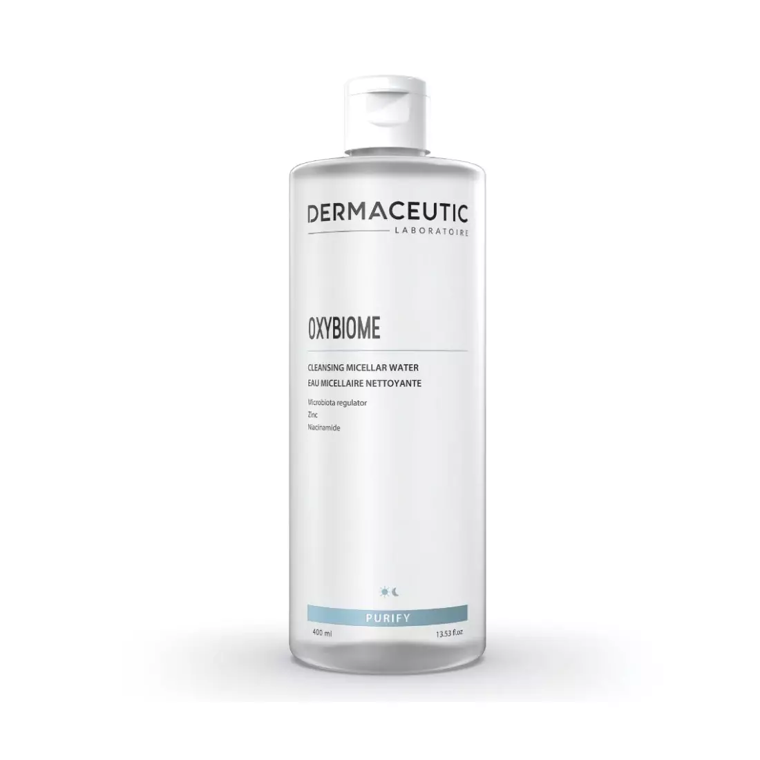 DERMACEUTIC OXYBIOME EAU MICELLAIRE NETTOYANTE démaquille efficacement et purifie la peau. Soutient le microbiote naturel de la peau. Effet anti-pollution.