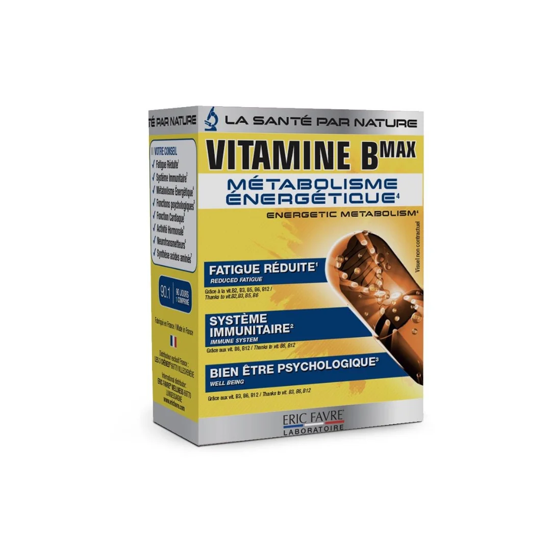 Vitamines B Max du laboratoire Eric Favre est un complément alimentaire riche en complexe de vitamines B (B1, B2, B3, B5, B6, B8, B9, B12), essentielles pour le métabolisme énergétique, le fonctionnement du système nerveux et la réduction de la fatigue.
