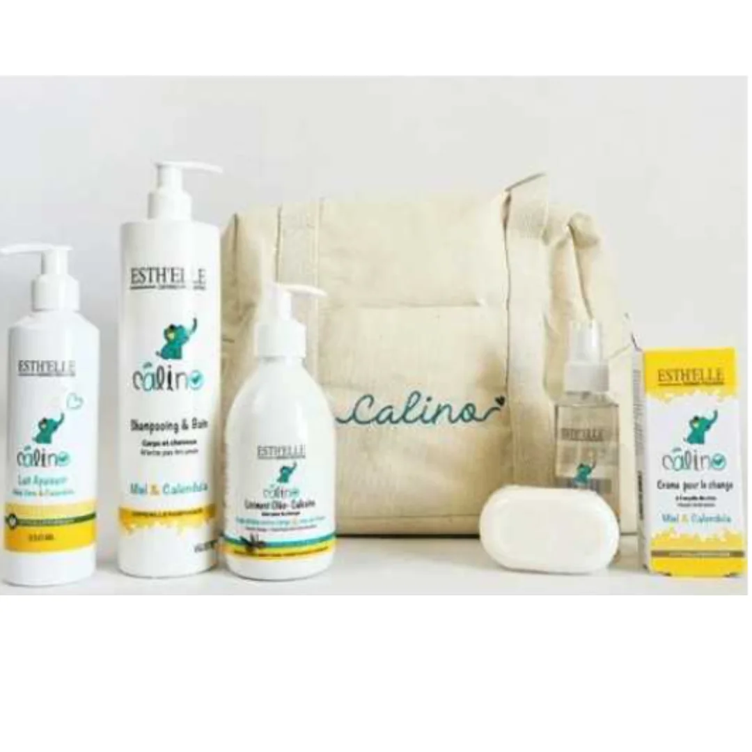 CALINO SAC MAMAN se compose de : Calino lait hydratant 250ML Calino liniment 300ML Calino savon Calino shampoing bain 500ML Calino eau de senteur 100ML Calino crème pour le change 50Gr