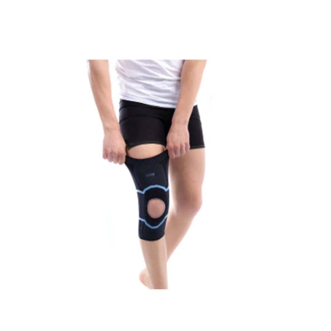 Une stabilisation rotulienne et soutien du genou favorisant la réduction de la pression pour un traitement et un amortissement rotulien, une forme anatomique et une ouverture rotulienne pour centrer le genou.
