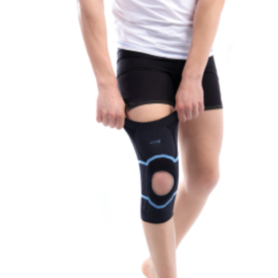 Une stabilisation rotulienne et soutien du genou favorisant la réduction de la pression pour un traitement et un amortissement rotulien, une forme anatomique et une ouverture rotulienne pour centrer le genou.