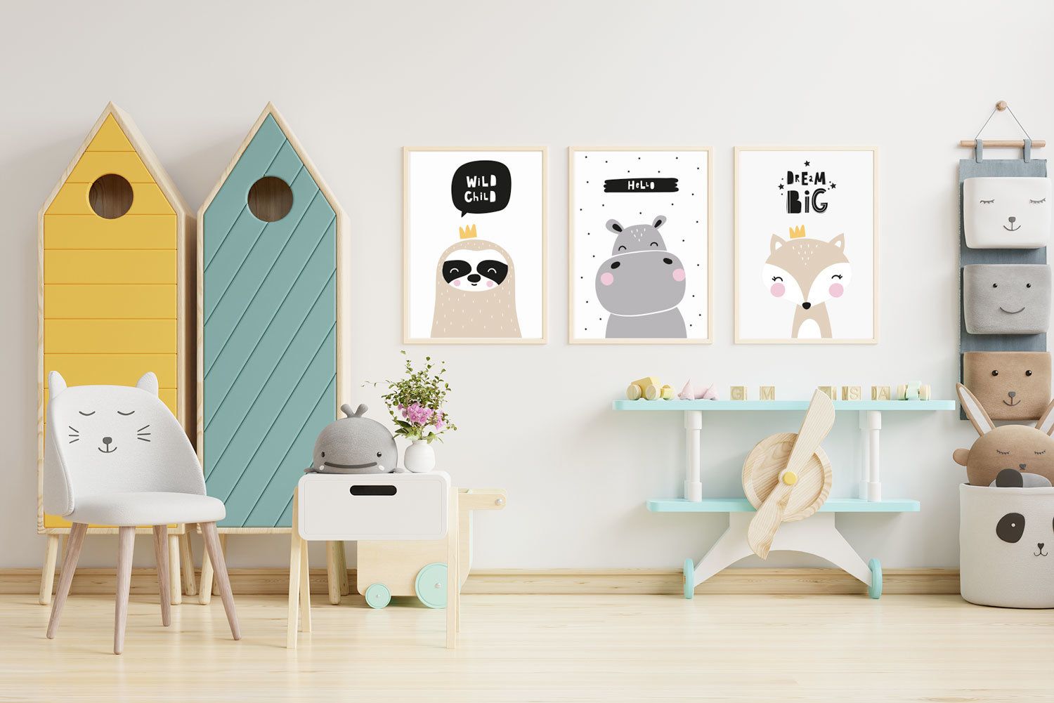 Lot de 3 affiches pour enfant 30x40cm ou 50x70cm Portraits d’animaux amusants style scandinave Impression numérique haute qualité avec des encres latex Papier de qualité 150g/m2 Finitions mat Expédition sous 5 à 8 jours ouvrés