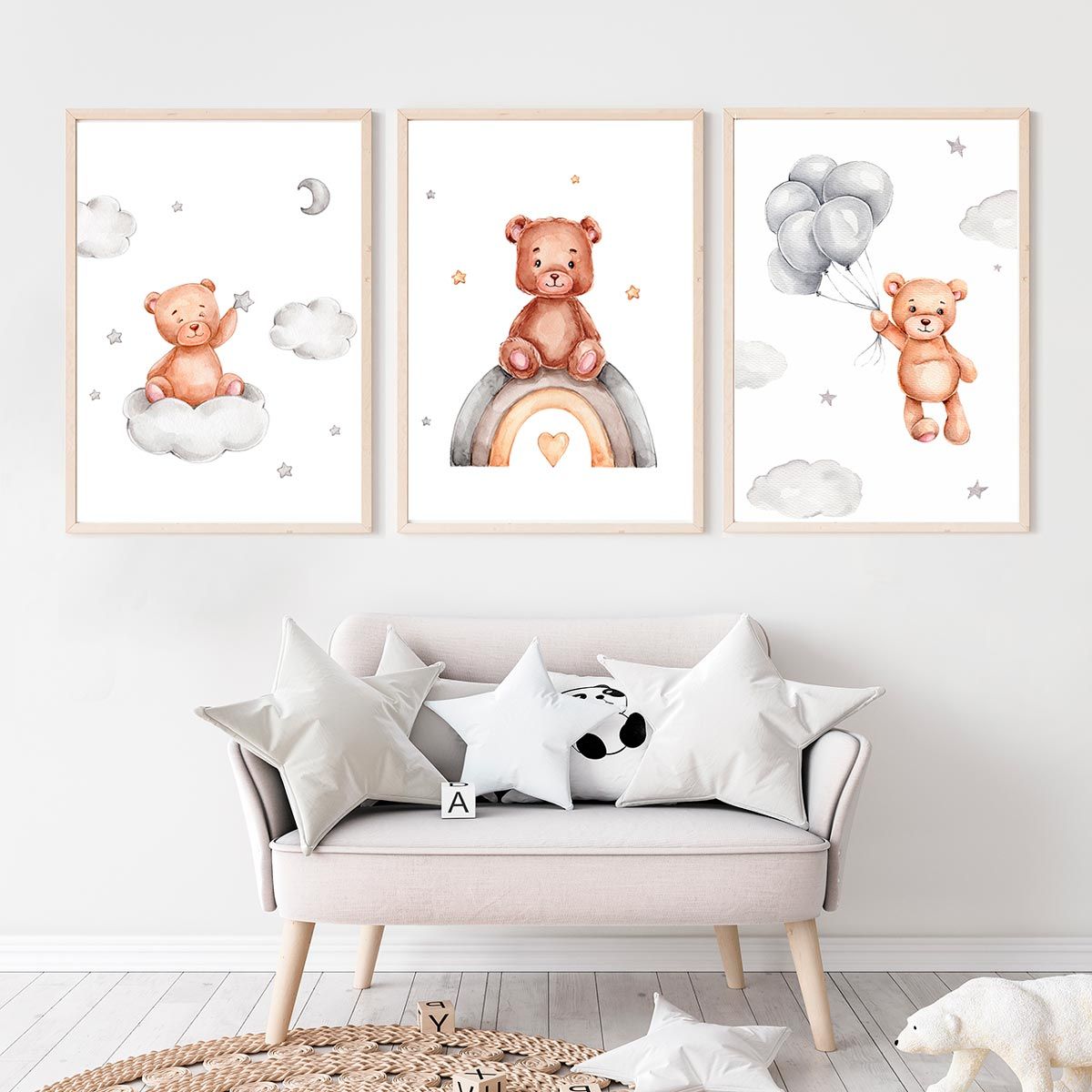 Lot de 3 affiches ourson dans les nuages pour bébé