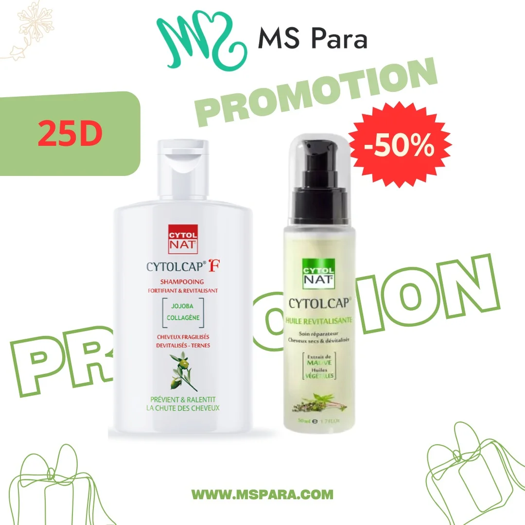 PACK CYTOLCAP CYTOL CYTOLCAP F SHAMPOOING FORTIFIANT REVITALISANT,200ML + CYTOLNAT CYTOLCAP HUILE REVITALISANTE,50ML – 50%