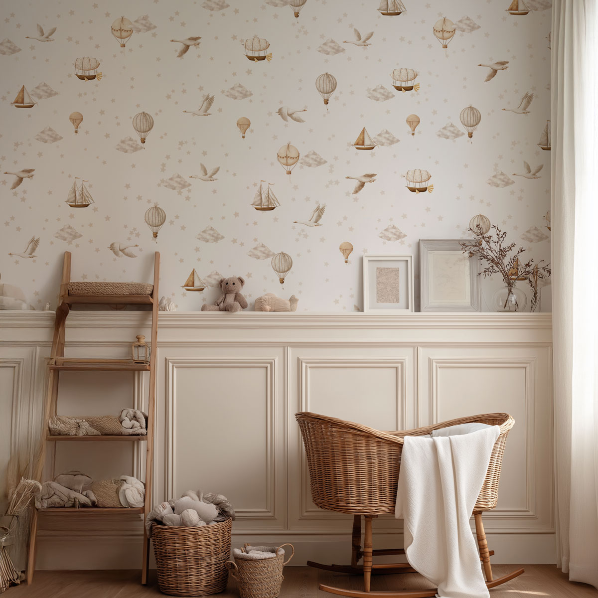 Invitez la douceur du ciel dans la chambre de votre bébé avec Au Fil du Vent, un papier peint aux motifs délicats et répétitifs. Dans des tons neutres beige et crème, de petites montgolfières, des oies légères, des nuages cotonneux et même des voiliers dans les airs composent un univers tendre et rassurant.
