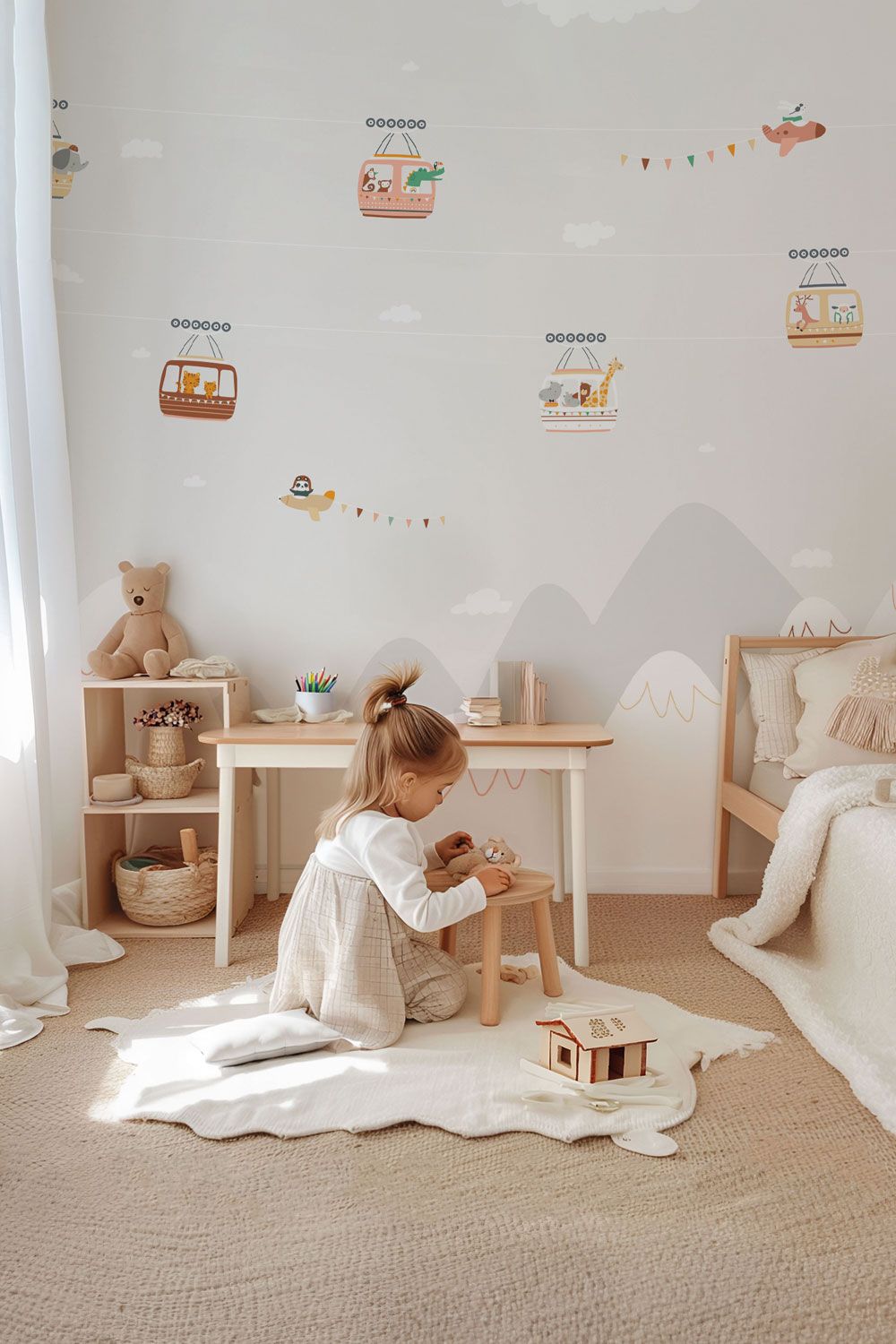 Découvrez le charme de l’hiver avec notre papier peint pour enfant « Aventure Alpine ». Ce magnifique design représente des animaux adorables dans des cabines de ski, suspendus au-dessus des montagnes enneigées. Les couleurs douces et les détails enchanteurs créent une ambiance magique et hivernale, idéale pour la chambre de votre petit(e) aventurier(e). Chaque cabine abrite un animal différent, apportant une touche ludique et fantaisiste à la décoration. Parfait pour stimuler l’imagination et offrir une escapade vers les sommets alpins, ce papier peint transformera la chambre de votre enfant en un véritable pays des merveilles hivernal.