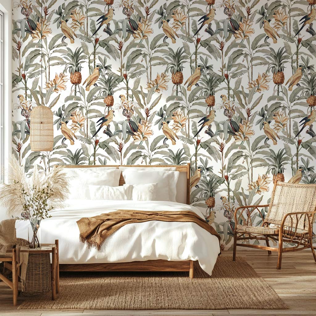 Créez une ambiance tropicale chic avec notre papier peint Bananier Exotique, une véritable invitation au voyage. Son design raffiné met en scène de luxuriants bananiers peints à l’aquarelle, accompagnés d’un perroquet majestueux, de feuillages exotiques, de bananes et d’ananas. Dans des tons jaunes chaleureux et vibrants, ce motif apporte à votre intérieur une touche d’exotisme et de vitalité, parfaite pour insuffler une atmosphère à la fois dépaysante et élégante.
