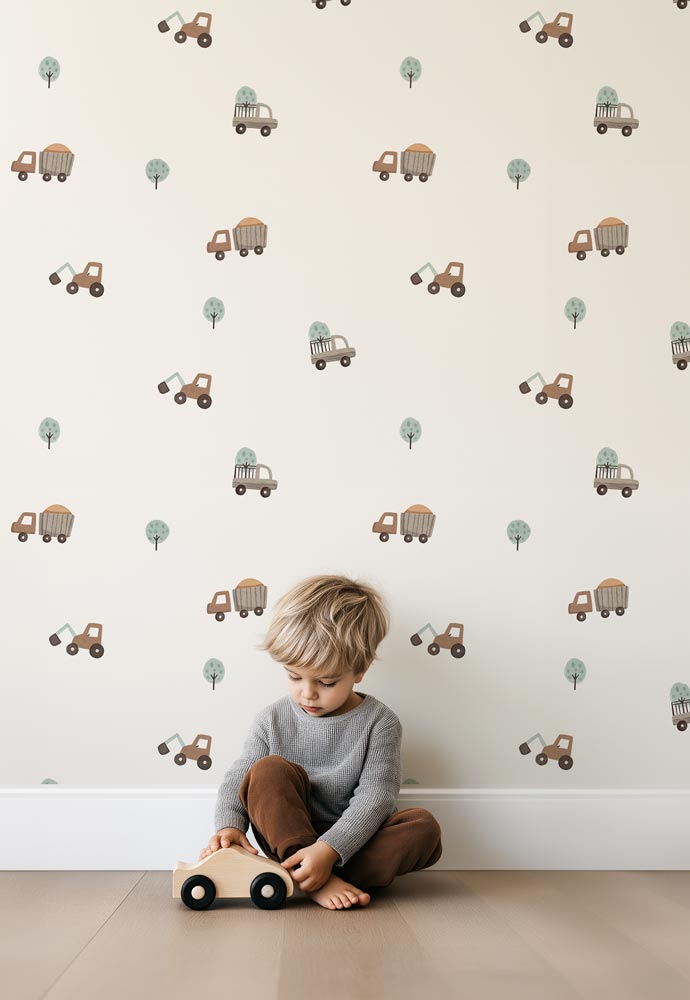 Transformez la chambre de votre enfant en un univers tendre et ludique avec notre papier peint Camions en Forêt. Sur un fond crème doux et apaisant, se dessinent de petits camions de chantier et de jolis arbres stylisés, dans un motif minimaliste inspiré du design scandinave.