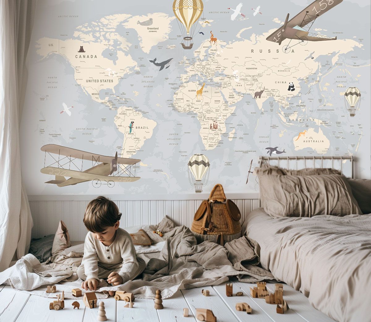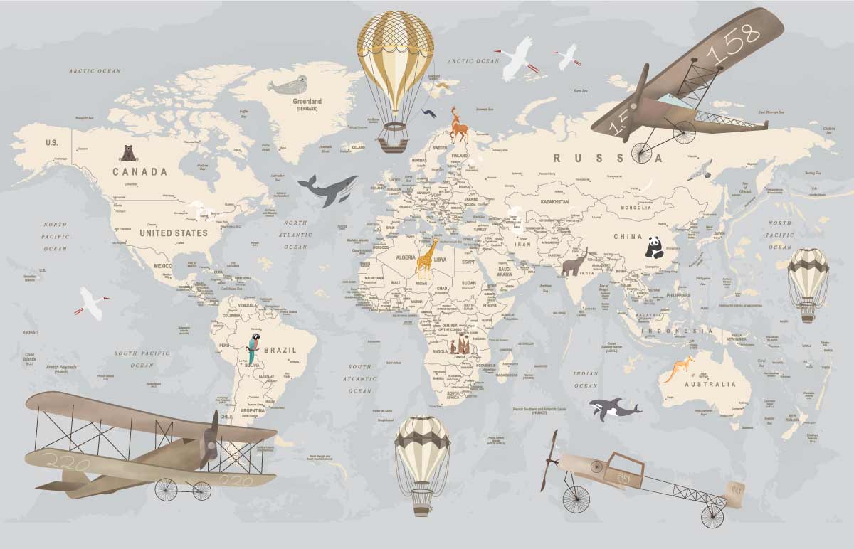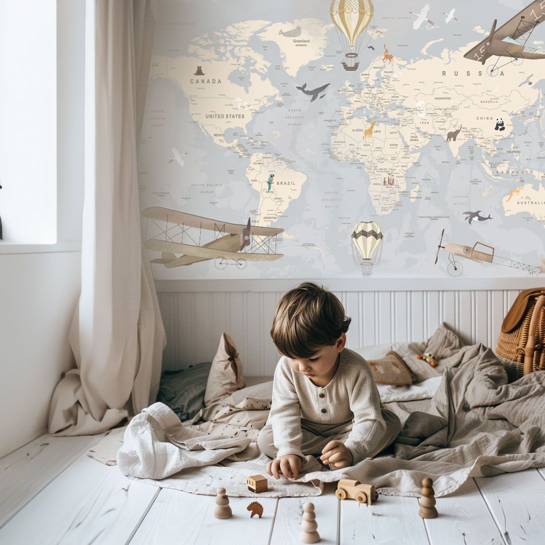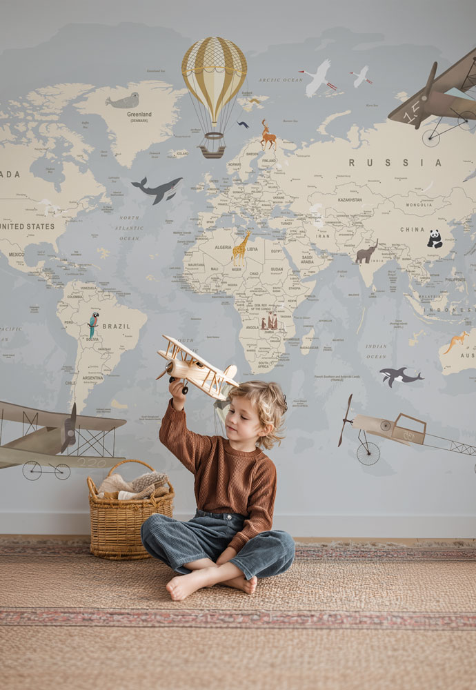 Plongez dans une exploration fascinante avec notre carte du monde détaillée pour enfants. Faites découvrir à vos enfants les continents merveilleux de notre planète et ses villes du monde. Dans un style vintage, dans les tons bleus et beige, cette carte est une véritable invitation au voyage, parsemée de détails éducatifs. Des montgolfières et des avions survolent les terres lointaines, ajoutant une touche de magie à cette aventure cartographique. Des animaux emblématiques animaux cette carte des merveilles, éveillant la curiosité des petits explorateurs. Disponible dans une variété de couleurs, ce papier peint ludique et éducatif est parfait pour transformer la chambre d’un enfant en un sanctuaire de découverte et d’apprentissage.