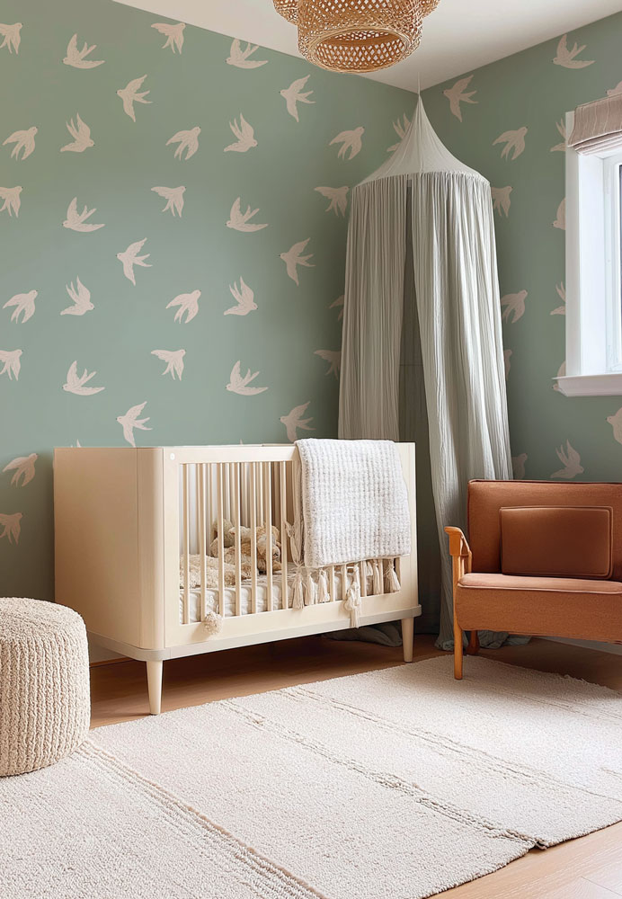 Chaque volée de colombes capturée sur un arrière-plan pastel crée une ambiance rétro raffinée, mariant le charme d’antan avec une touche moderne. Les tons doux et apaisants des pastels offrent une palette de couleurs subtile, apportant à votre espace une sensation de légèreté et de tranquillité. Ajoutez à la chambre de votre enfant une note de poésie aérienne notre papier peint.