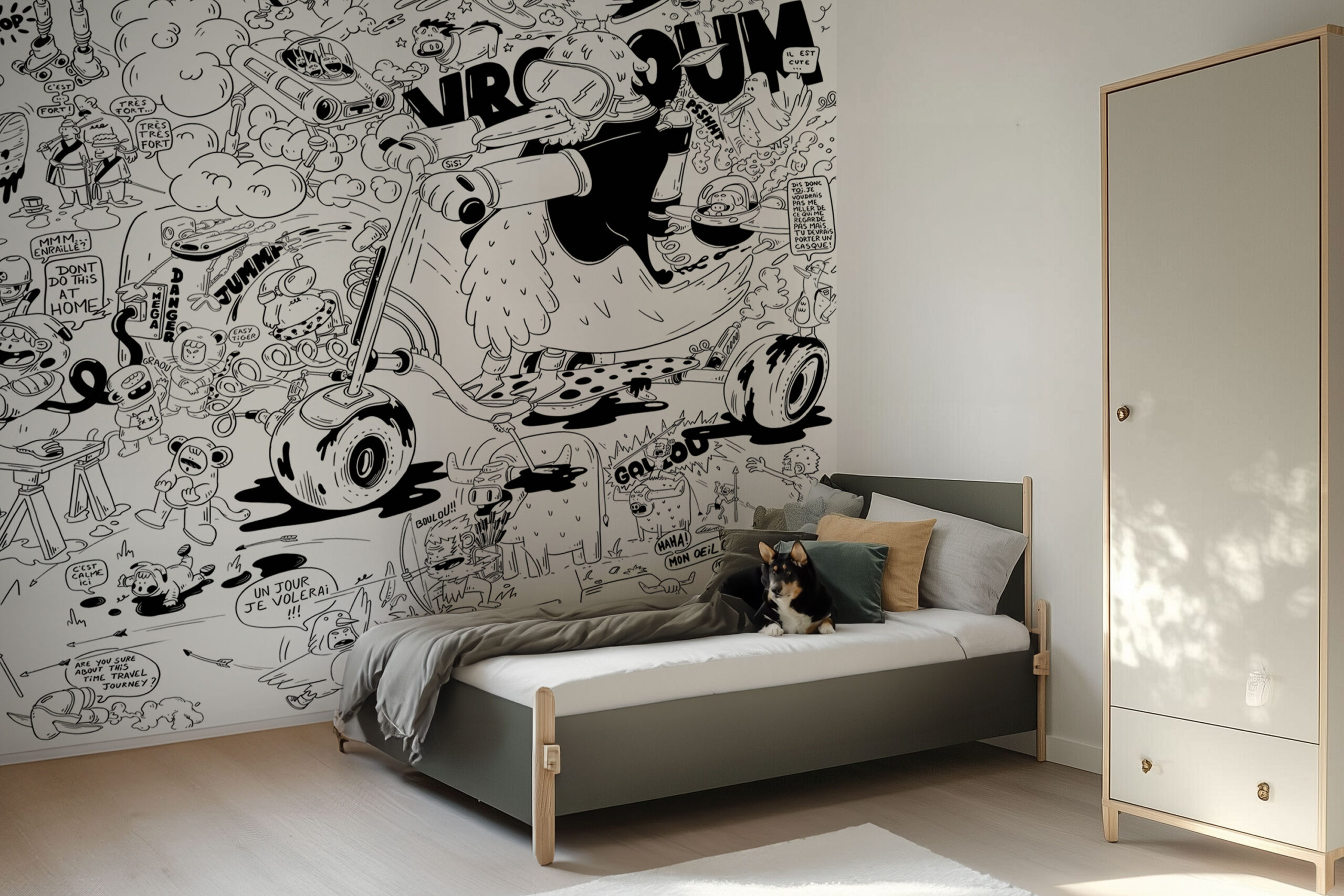 Plongez dans un décor ultra dynamique avec le papier peint panoramique Comics Crash, un véritable hommage à l’univers de la BD et du cartoon. Ce papier peint monochrome, noir et blanc ou couleurs, percutant, inspiré des comics, déborde d’action et d’humour avec des personnages délirants et des onomatopées explosives. Idéal pour une chambre d’enfant ou d’ado, il trouvera aussi sa place dans l’univers d’un adulte passionné de bande dessinée.