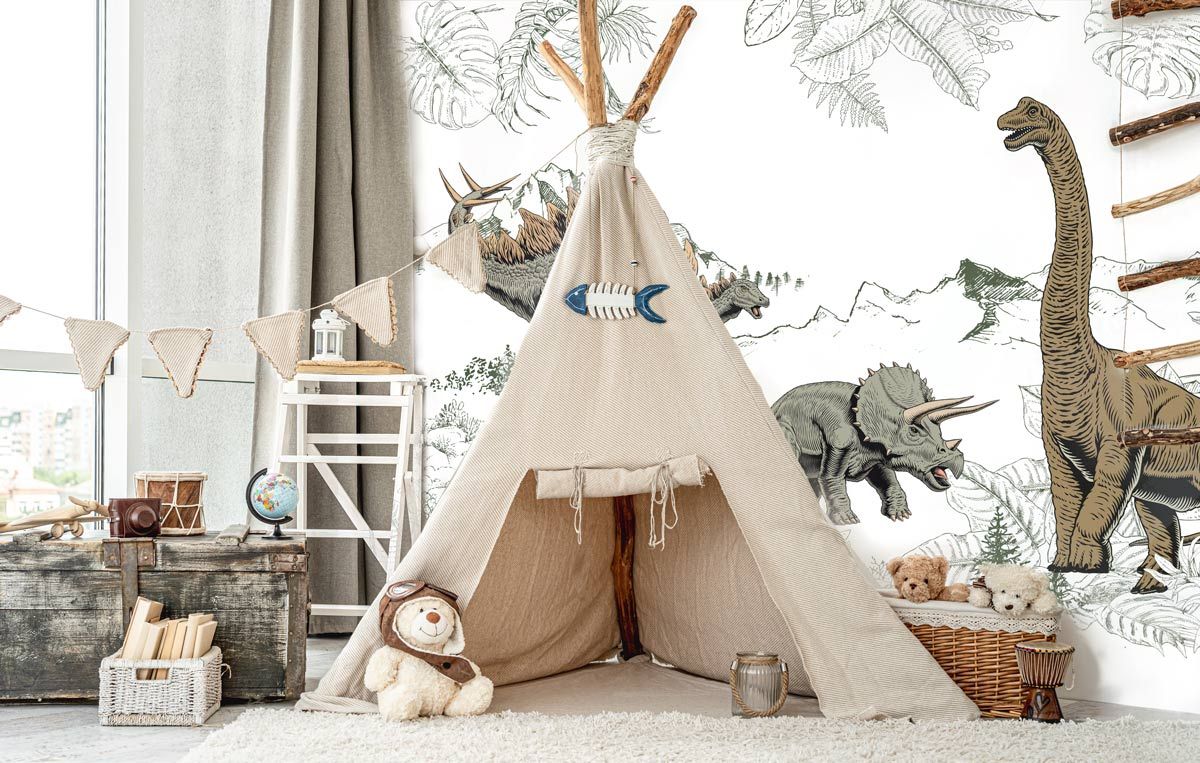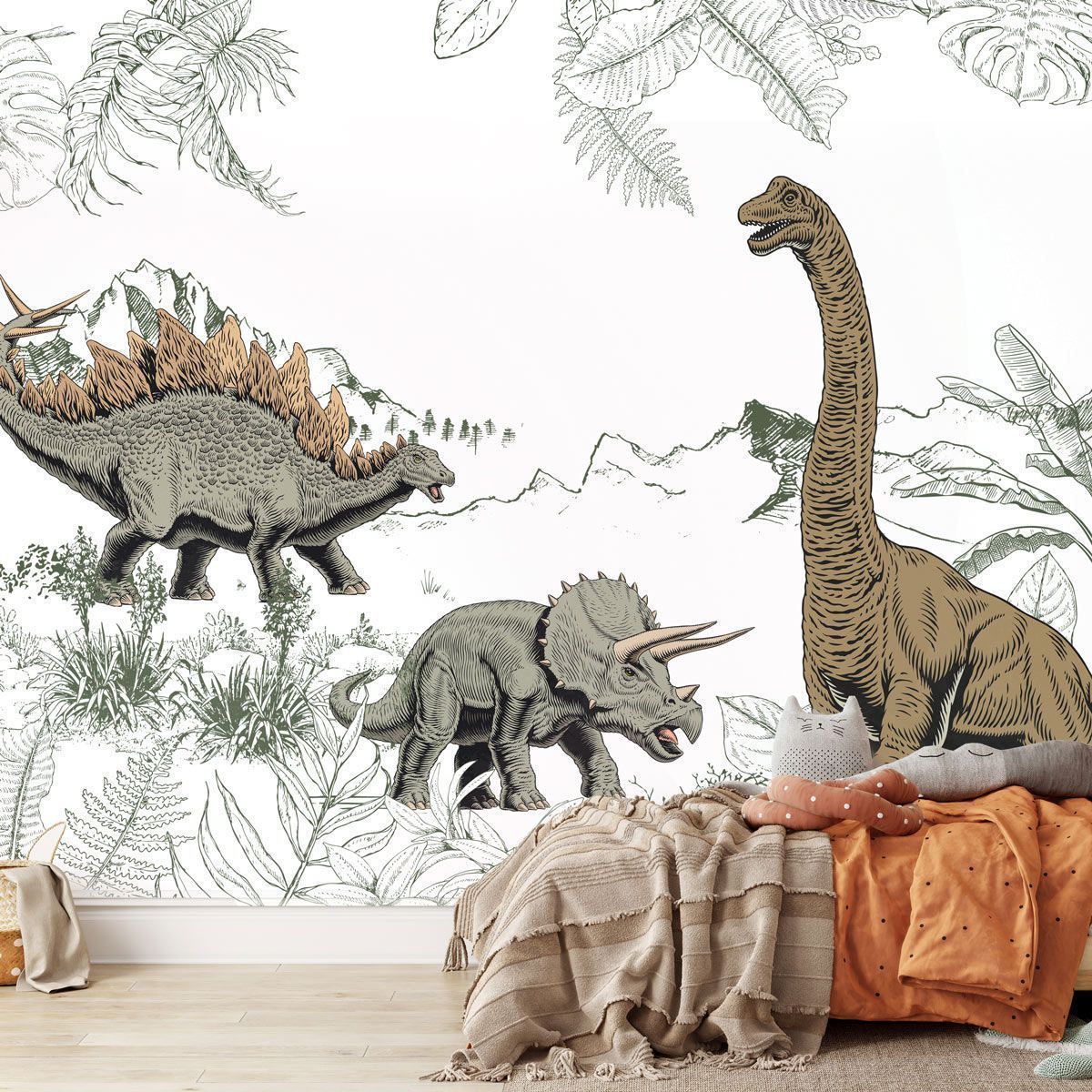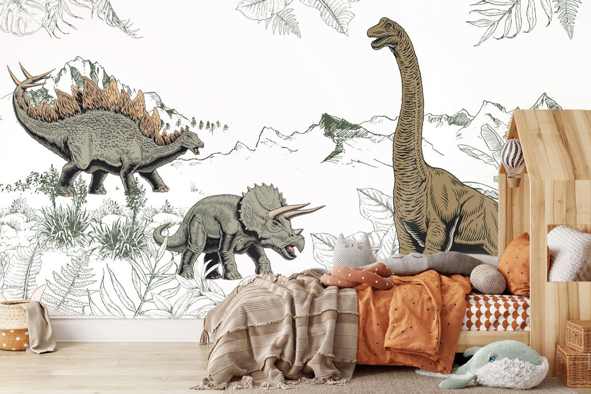 Transformez la chambre de votre enfant en un monde préhistorique captivant avec ce papier peint panoramique Dinosaures. Offrez-leur un espace où leur passion pour les dinosaures prend vie, stimulant leur curiosité et leur offrant un lieu où leur imagination peut s’épanouir. A travers ce motif panoramique, vos enfants feront un voyage à travers le temps immédiat. Conçu dans des couleurs modernes et intemporelles, ce papier peint transformera instantanément les chambres de vos petits aventuriers.