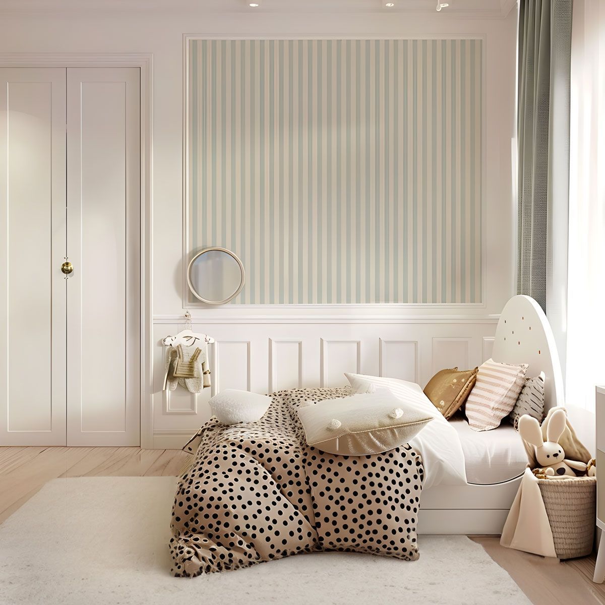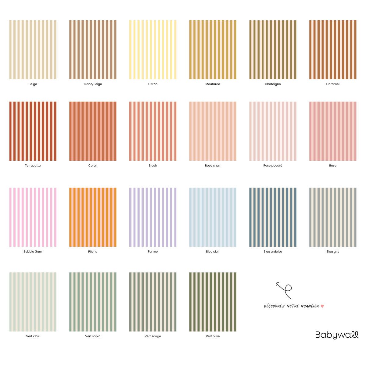 Ajoutez une touche de style et de couleur à la chambre de votre enfant avec notre papier peint à fines rayures (env. 5cm). Ce design tendance et coloré propose une combinaison élégante de deux couleurs, offrant une multitude de possibilités pour personnaliser l’espace de votre petit bout. Les rayures, à la fois classiques et modernes, apportent une dynamique visuelle qui s’adapte parfaitement à une variété de décors. Avec de nombreuses combinaisons de couleurs disponibles, vous pouvez choisir celles qui correspondent le mieux à l’ambiance souhaitée, qu’elle soit douce et apaisante ou vive et énergique. Si vous ne trouvez pas votre bonheur parmi notre palette, n’hésitez pas à nous contacter pour faire votre duo.