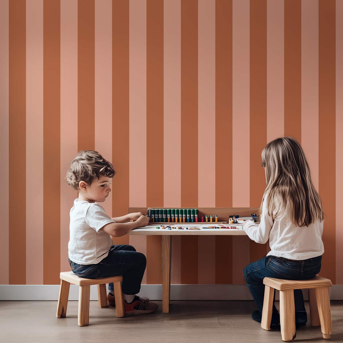 Optez pour une harmonie de couleur avec le papier peint Bronze de notre collection Nude, apportant une ambiance à la fois douce et réconfortante. Ses rayures verticales combinent avec finesse le terracotta et le rose poudré, des tons chauds et très tendances, pour sublimer votre intérieur. Le jeu subtil de ces rayures verticales crée une impression de hauteur, idéale pour structurer l’espace avec style. Cette tapisserie est disponible en deux formats : des rayures larges de 9 cm ou des rayures fines de 5 cm, pour s’adapter au mieux à vos préférences. Parfait pour une chambre ado/enfant, un salon ou un bureau, ce papier peint transforme instantanément l’atmosphère de la pièce, lui conférant une personnalité chaleureuse et élégante.