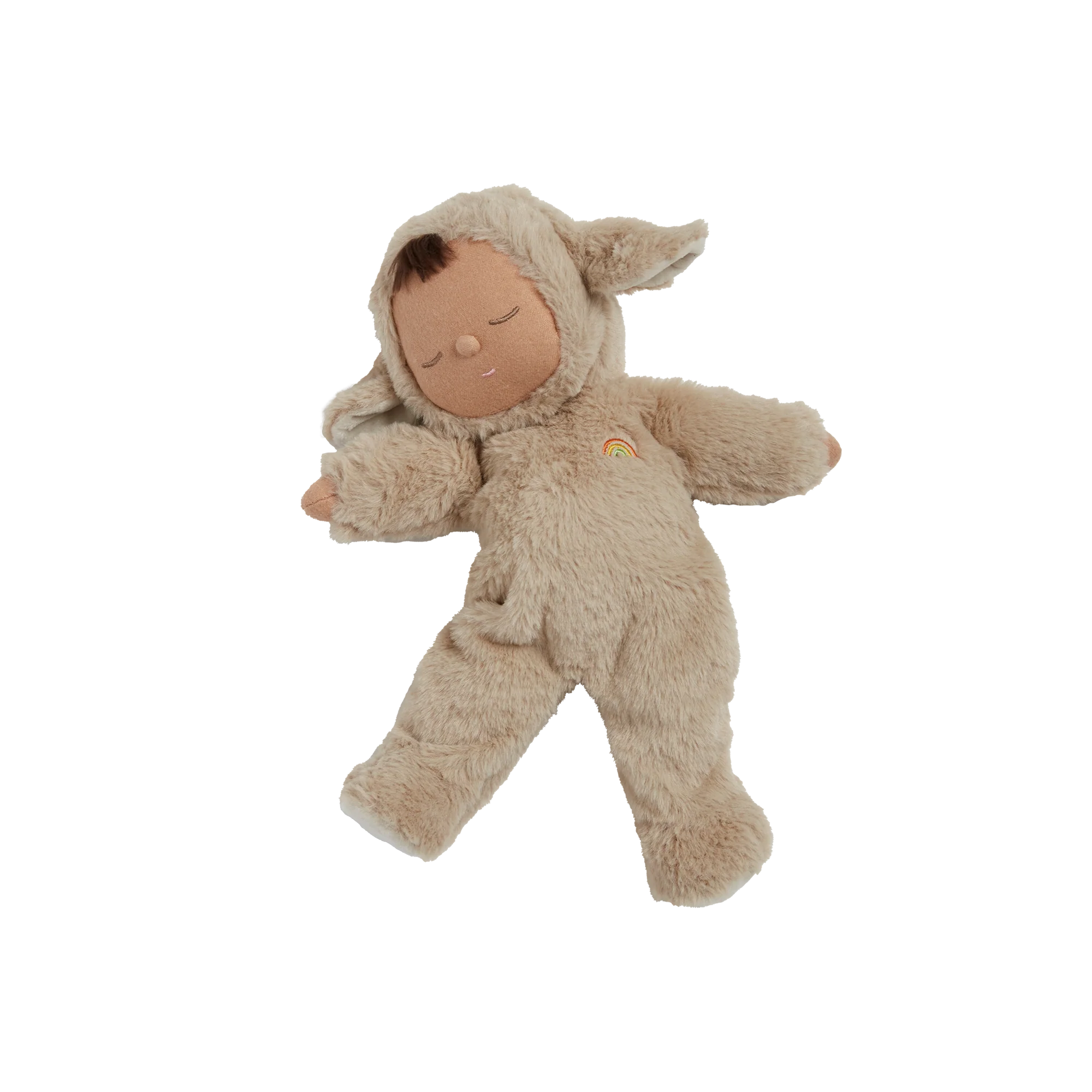 La poupée Cosy Dinkum agneau gris, si câlin et mignon, adore somnoler dans son costume doux et moelleux. Conçu pour les câlins et les dodos ! Elle porte une combinaison en peluche non amovible avec des oreilles et un arc-en-ciel brodé sur le cœur.