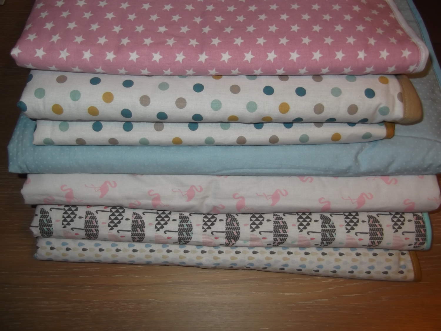 | Couleur | Blanc à pois bleus, Bleu clair à pois blancs, Flamants roses, Gouttes d'eau, Parapluies, Rose et étoiles |