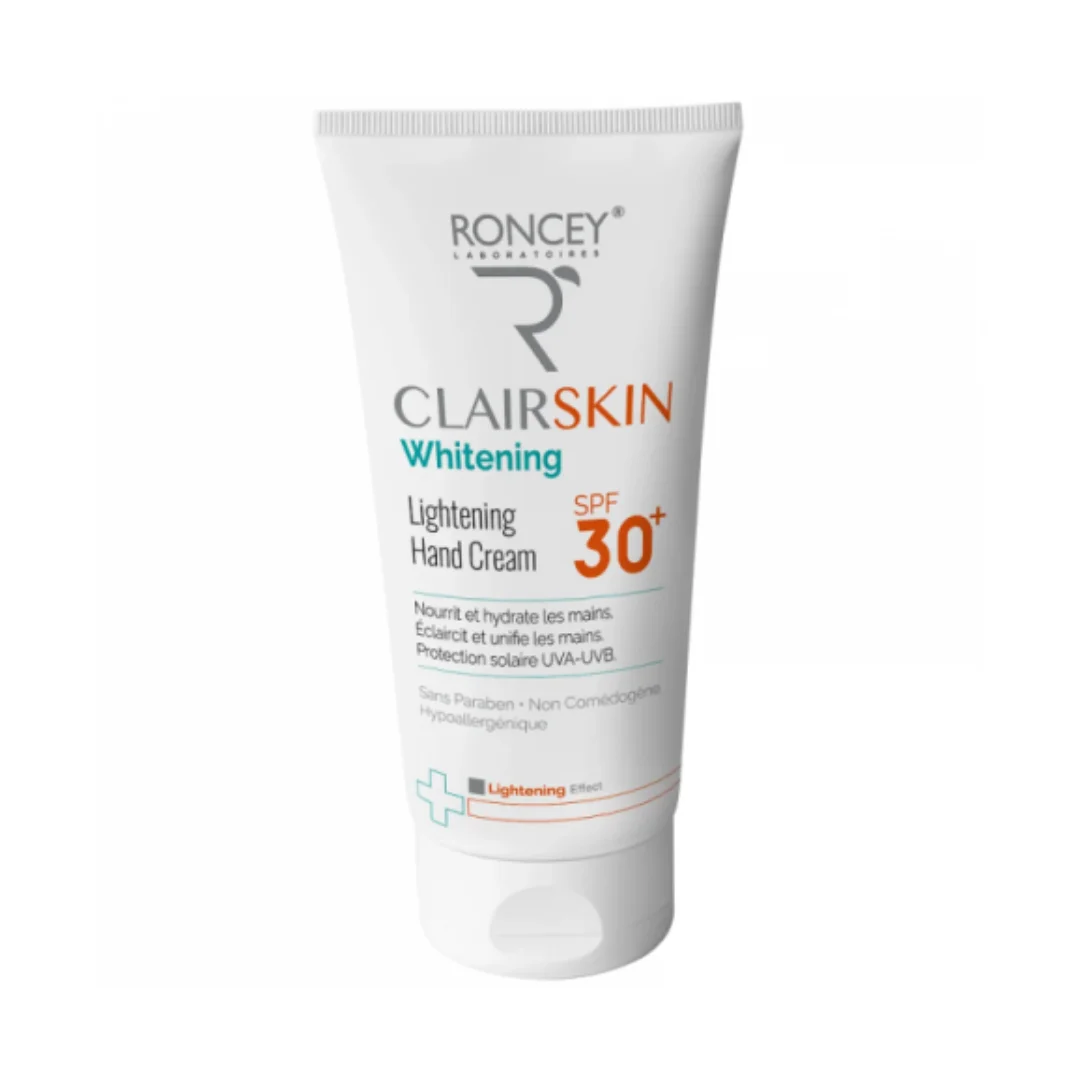 RONCEY CLAIRSKIN CRÈME MAINS SPF30+ – 100ML💰 Prix : 39.900 TND La Crème Mains SPF30+ Clairskin de Roncey est spécialement formulée pour hydrater, protéger et éclaircir les mains tout en les préservant des taches pigmentaires causées par le soleil et le vieillissement cutané. Grâce à sa protection SPF30+, elle forme un bouclier contre les rayons UV tout en nourrissant intensément la peau pour des mains douces, éclatantes et visiblement plus jeunes.