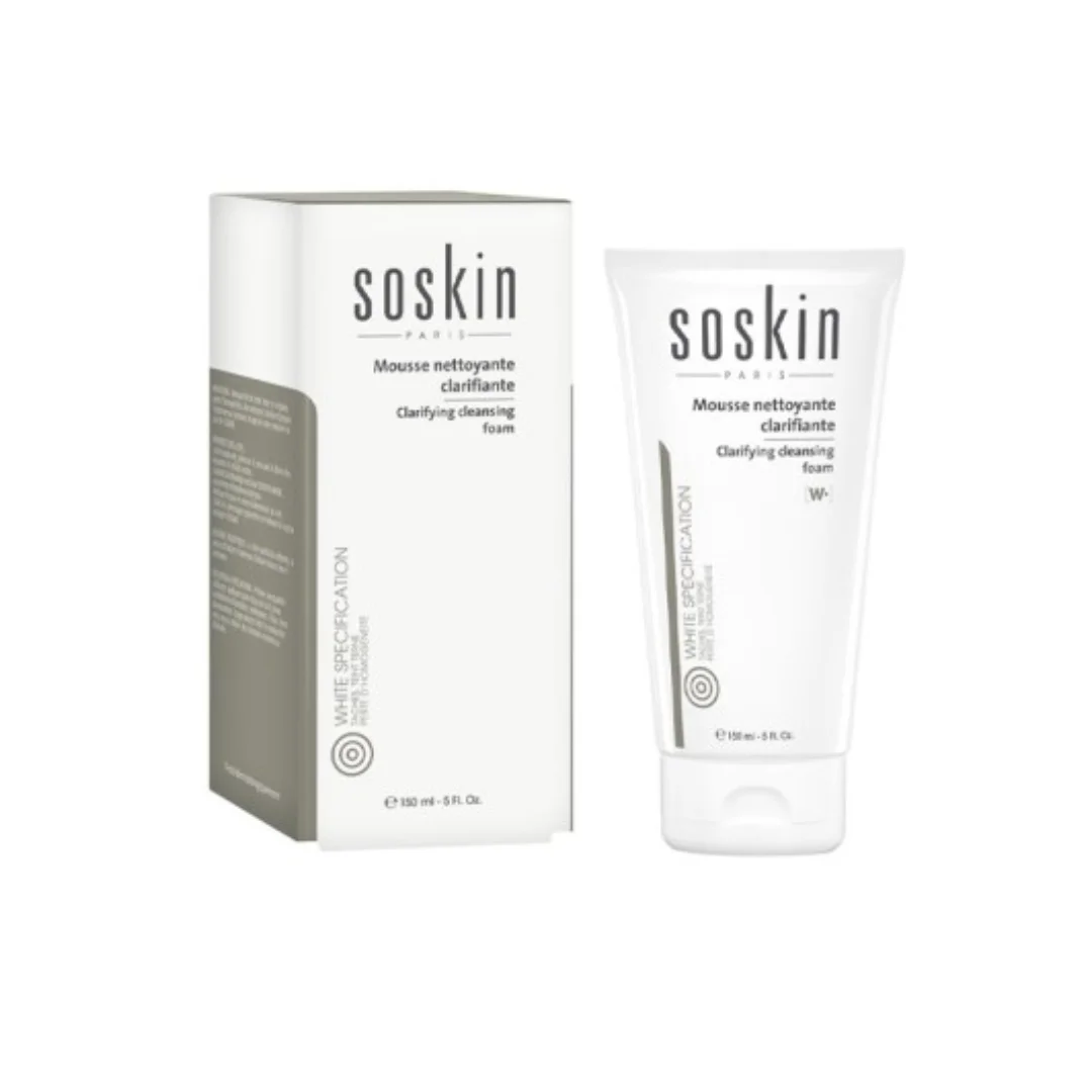 La mousse nettoyante clarifiante SOSKIN nettoie la peau de la saleté et des cellules mortes tout en préparant la peau pour la routine de blanchiment W + Soskin.