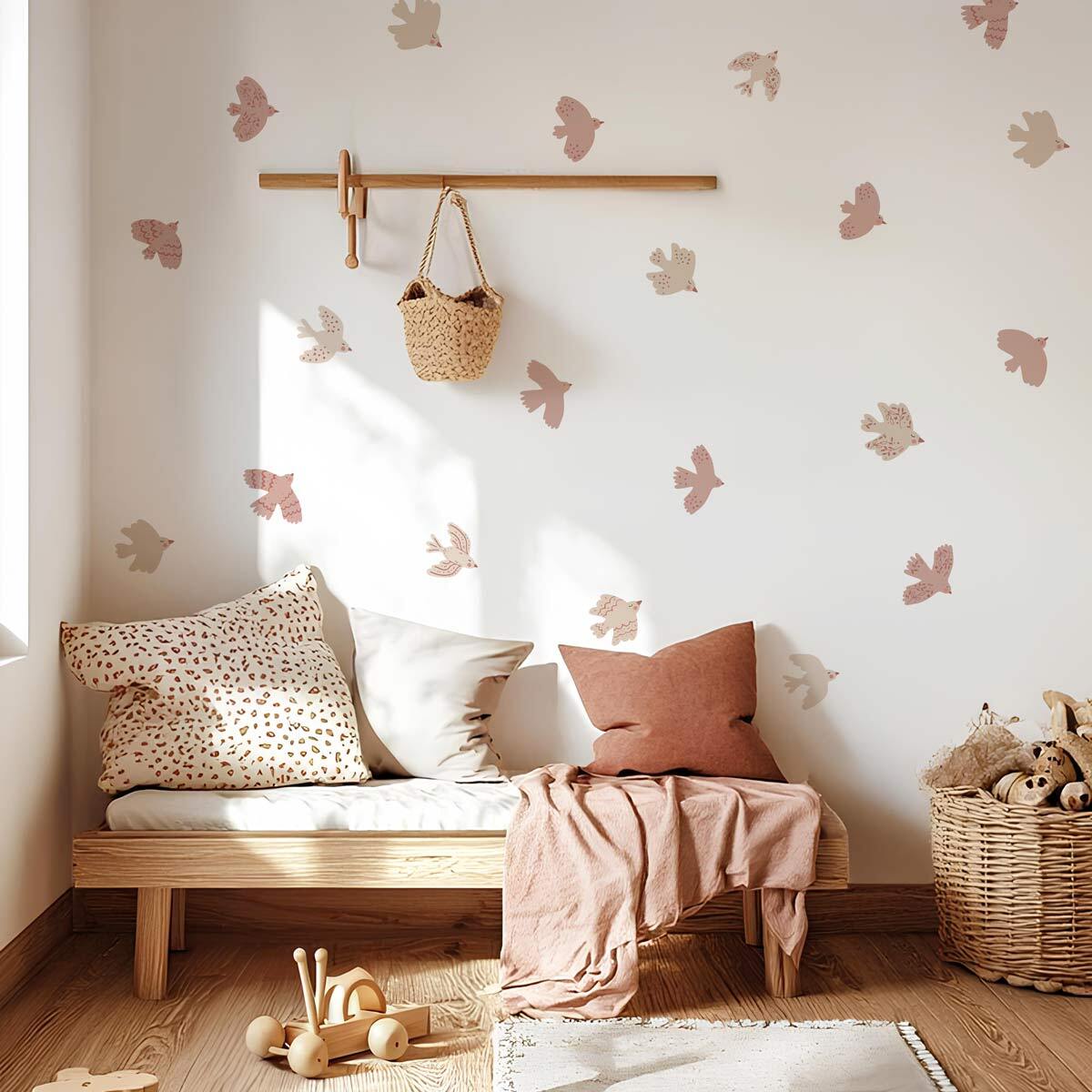 Set de 52 stickers Fabriqués en France Repositionnables Planche d’une cinquantaine d’hirondelles couleur pêche ou rose (au choix) pour décorer les murs de la chambre de votre enfant de manière originale.
