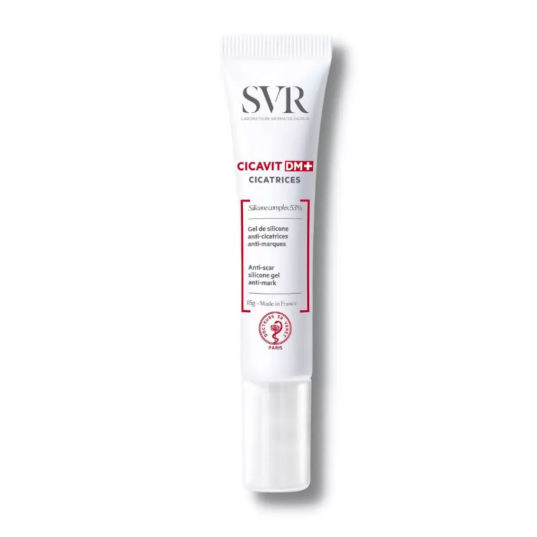 svr cicavit dm+ cicatrices 15 g est un gel de silicone anti-cicatrices anti-marques indique pour visage, corps, articulations, zones mobiles.