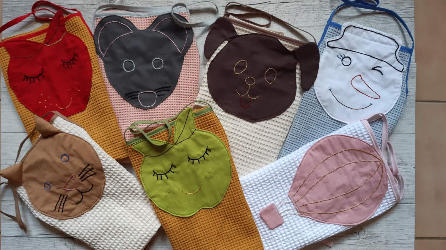 Ces tabliers, 100 % coton, pour les enfants à partir de 3 ans, ont été imaginés, dessinés, brodés à la main.