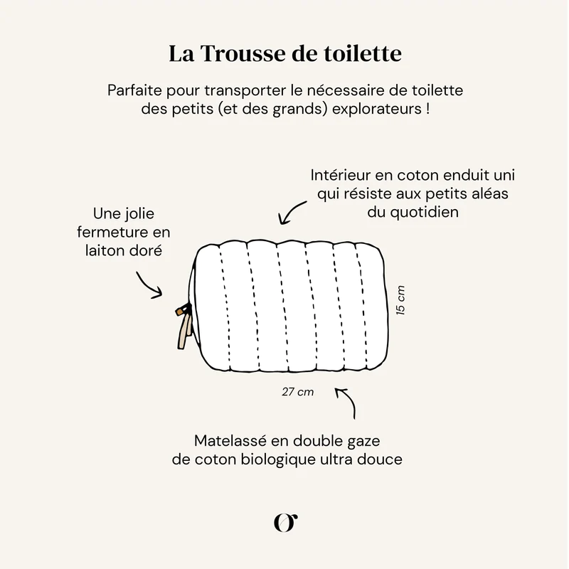 Trousse de toilette matelassée en double gaze de coton biologique ultra douce, le format idéal pour transporter le nécessaire de toilette des petits (et des grands) explorateurs