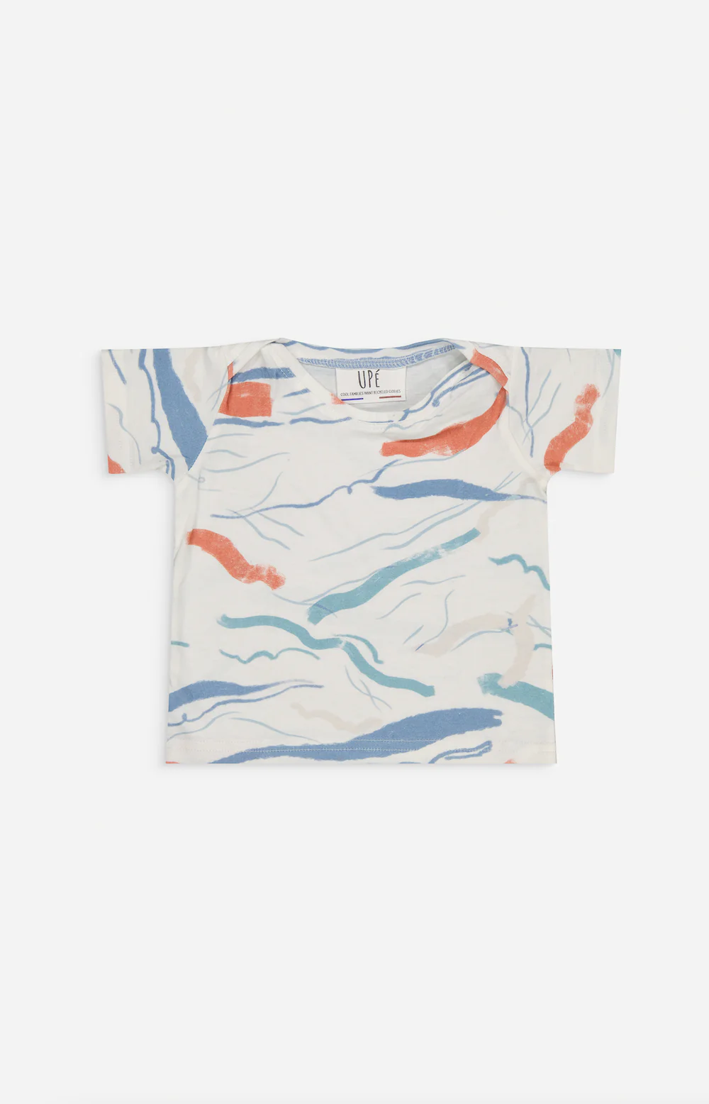 En jersey de coton biologique et coton recyclé, cette pièce est complètement recyclable et garantit un grand confort pour l’enfant. Le motif représente la mer… le motif phare de la marque Upé pour cette saison !