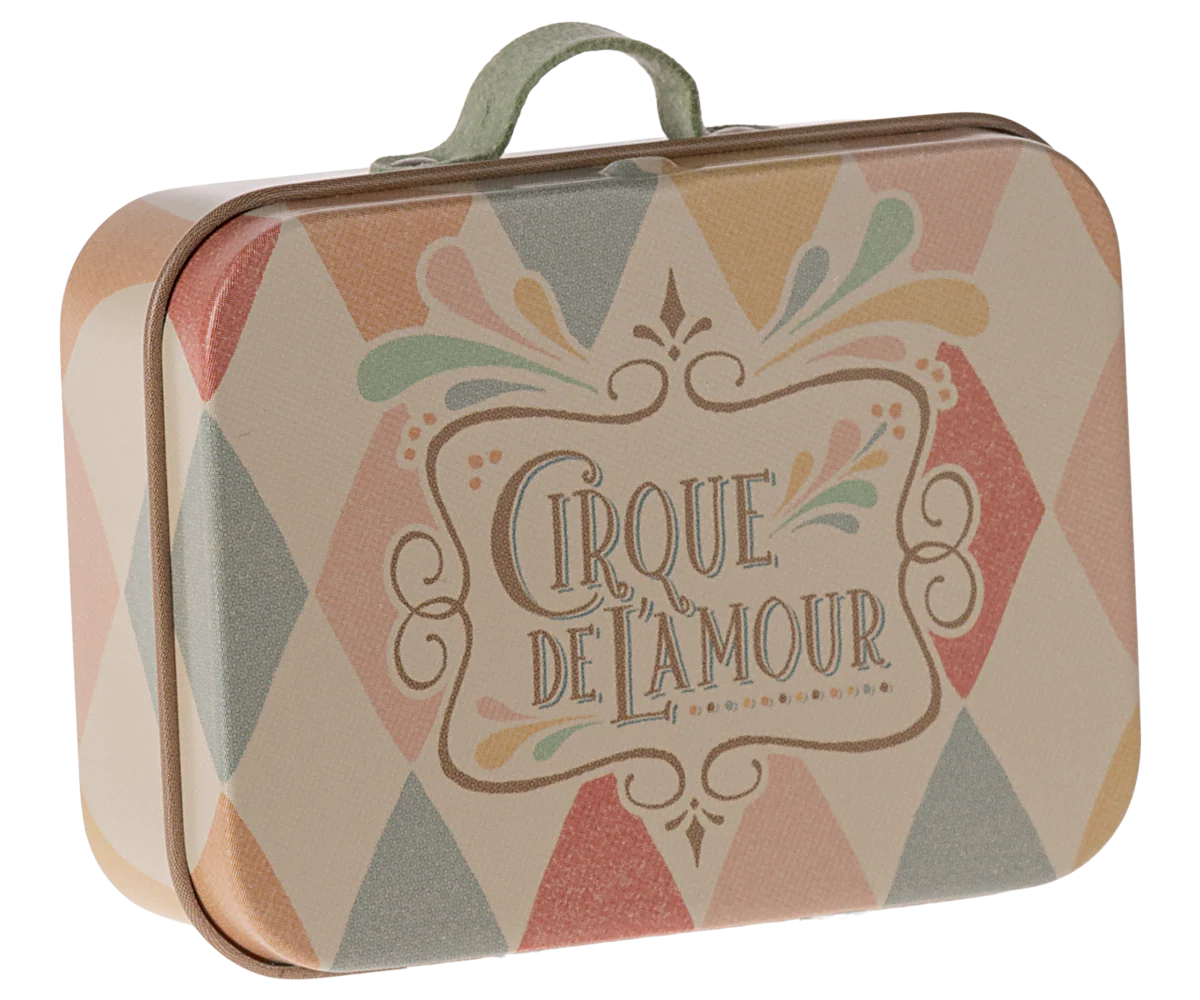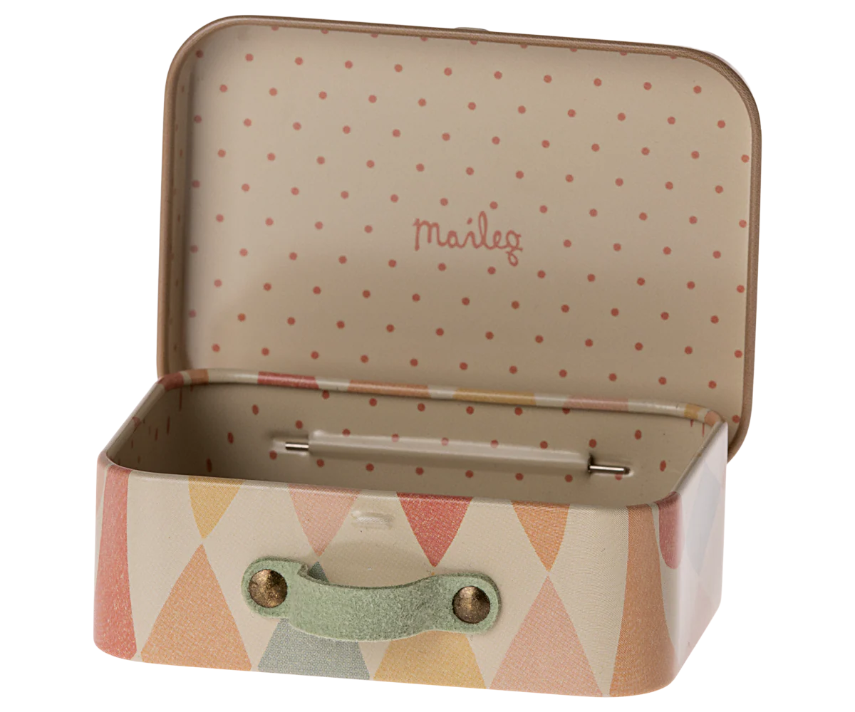 Cette valisette, en métal, avec ses illustrations colorées et jolis détails, peut être utilisée en toutes occasions : cadeaux, rangement de petits objets ou pour les souris et petits lapins qui veulent emporter leurs affaires.