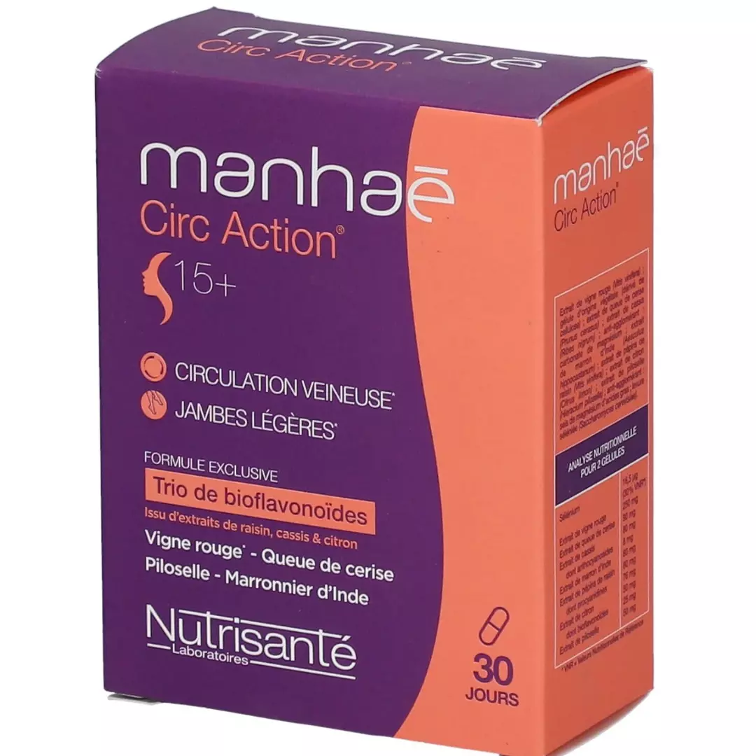 Manhaé Circ Action est un complément alimentaire, sa formule développée pour les besoins des femmes, repose sur une association unique : trio de bioflavonoïdes : extraits de raisin, cassis et citron, vigne rouge, queue de cerise, piloselle et marronnier d’Inde.
