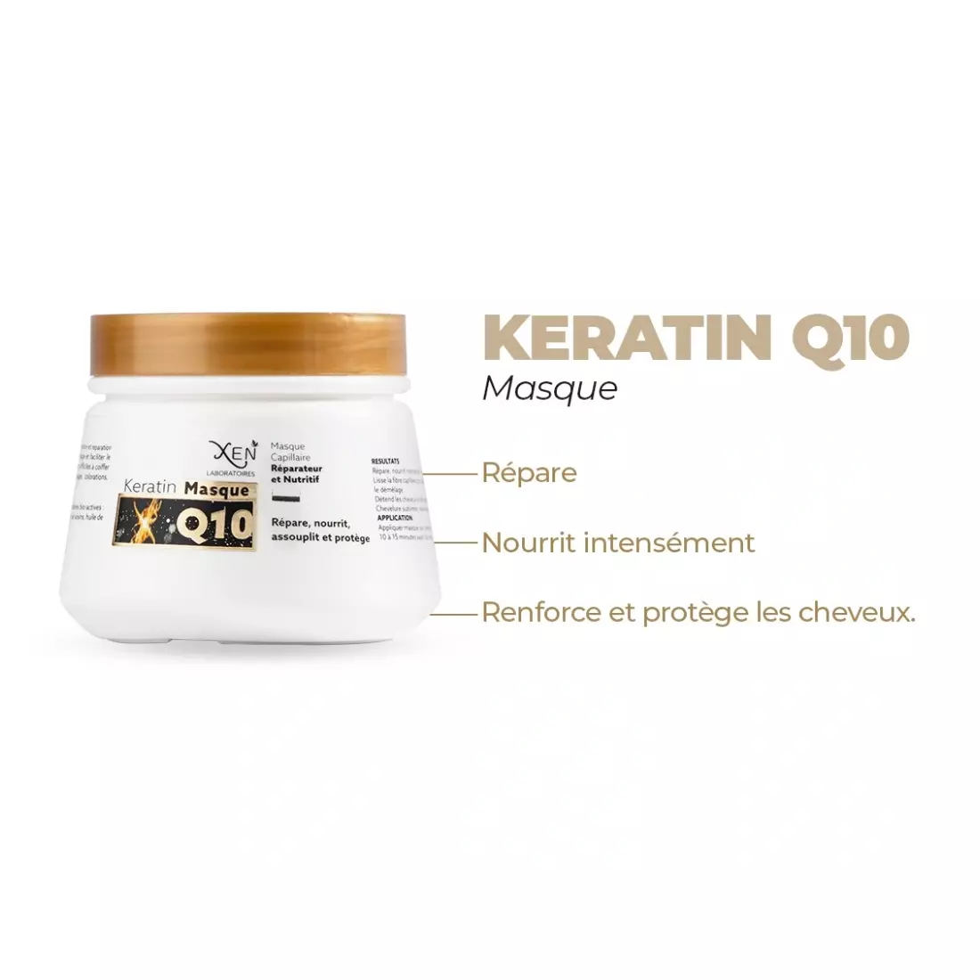 XEN KERATIN Q10 MASQUE est un soin nourrissant exceptionnel qui combine des traitements de nutrition et de réparation conçus pour nourrir, réparer et renforcer l’effet lissant des cheveux secs, abîmés, cassés, difficiles à manipuler et soumis à de multiples agressions (brossages, lavages, coloration, séchage…).